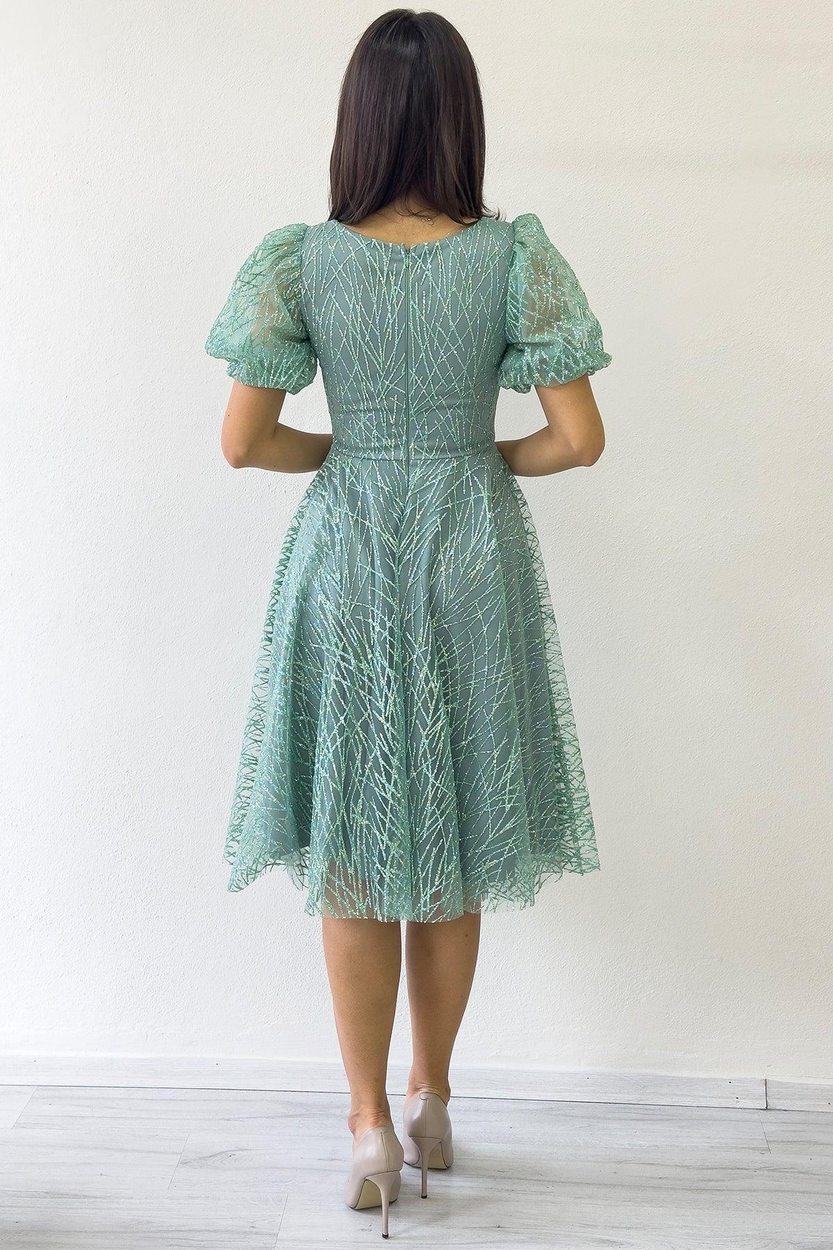 فستان سهرة قصير الأكمام قصير الطول باللون الأخضر المائي اللامع