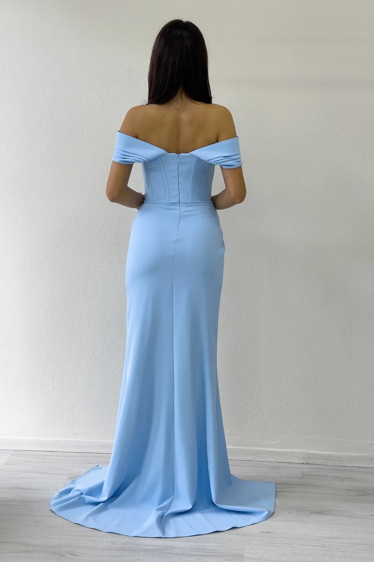 فستان سهرة أزرق فاتح مكشوف الكتفين بفتحة جانبية