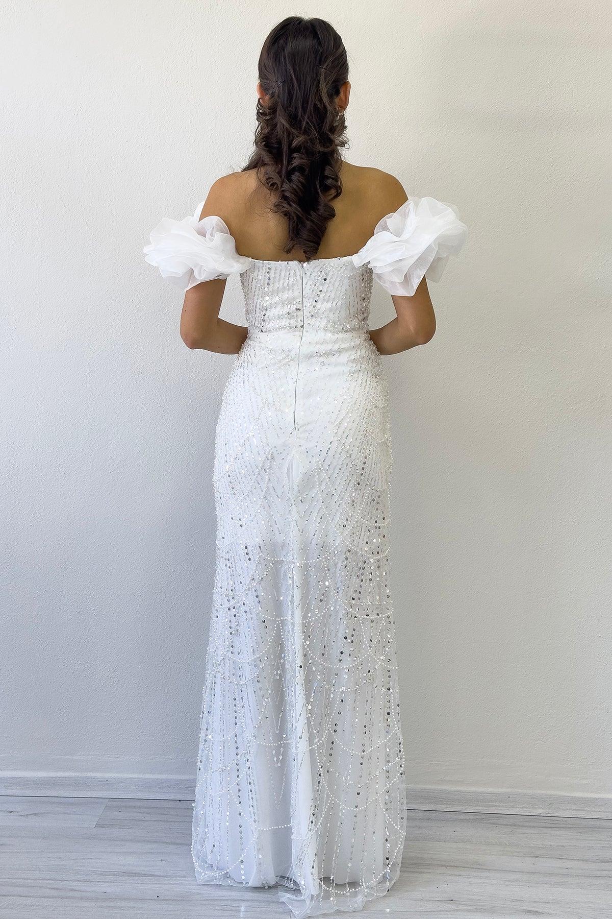 فستان سهرة أبيض مكشوف الكتفين مزين بالترتر