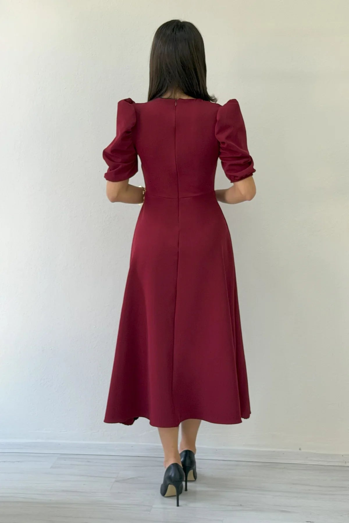 Burgundy Balloon Sleeve Volant Midi Dress Style and Usage Guide This eye-catching Burgundy Balloon Sleeve Midi Dress combines elegance and dynamic design, making it a standout piece in your wardrobe. The classic burgundy colour's regal appearance, combined with modern details, offers the wearer both everyday chic and a flawless style for special occasions. The Power of Design: Balloon Sleeves and Ruffles The most striking feature of the dress's design is the voluminous balloon sleeves. Ending at elbow length, these sleeves add a sophisticated touch to the shoulders while instantly lending the wearer a feminine and romantic air. The balloon sleeve detail elegantly frames the upper body and enhances visual balance. This voluminous design contrasts with the dress's simple bodice, creating a powerful fashion statement. The midi length ensures the dress is timeless and versatile. Neither too short nor too long, this ideal length elegantly shows off the legs without restricting movement. The flouncy layers at the skirt instantly add movement and joy to the dress. The ruffles, which gently sway with each step, give the dress a dynamic texture and fluidity. This detail creates a striking effect, especially when dancing or moving. Fabric and Comfort: Ease of Use The choice of this dress prioritises not only style but also comfort. The lightweight and breathable fabric ensures the dress can be worn comfortably throughout all four seasons. The quality of the fabric perfectly reflects the depth and richness of the burgundy colour, ensuring the dress looks luxurious even in the light. Thanks to its inner lining, there is no opacity issue and wearing comfort is maximised. Its flexible structure gently hugs the body without restricting it, thus offering comfort even during long events. Style Tips: How to Combine It? As burgundy is a rich and versatile colour, you can easily adapt this dress to different styles: 1. Formal and Elegant Invitations: For weddings, engagements or special dinners, complete your outfit with gold or silver-toned jewellery. Finish the look with stiletto heels and an elegant clutch bag for a luxurious and sophisticated appearance. In cold weather, you can drape a stylish shawl or cashmere coat over your shoulders. 2. Casual Chic and Office Environment: For a more everyday yet stylish look, pair the dress with short-heeled boots or elegant loafers. You can accentuate your silhouette by adding a thin, black belt at your waist. Wearing a cropped blazer jacket over it creates a professional yet fashionable office style without covering the dress's balloon sleeve detail. 3. Seasonal Transitions and Street Style: Achieve a cool look in autumn and winter with thick black tights and long boots. In spring/summer, you can create a relaxed, bohemian style with sandals and straw bags. The dress's bold colour creates a striking contrast with casual pieces such as a leather jacket or denim jacket. Conclusion The Burgundy Balloon Sleeve Midi Dress will be a must-have for women who value details and refuse to compromise on comfort and style. With its bold colour, flowy ruffles and romantic balloon sleeves, this dress is guaranteed to turn heads wherever you wear it. Personalise your style and make this piece the most special wildcard dress in your wardrobe.