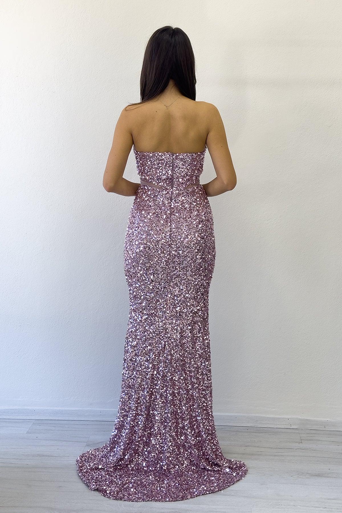 Powder Strapless Waistline Decolletage Sequined Evening Dress, With its elegant and modern design, it is one of the top choices for women who want to dazzle at special events. The strapless neckline detail highlights the shoulders, while the décolletage at the waist adds a touch of sophistication. The fabric, entirely embellished with sequins, sparkles in the light, ensuring you attract attention with every step. Its cut gracefully hugs the body's curves for a feminine look, while its fluid structure ensures a comfortable wearing experience. An impeccable choice for weddings, engagements, graduations, parties and gala nights, this dress carries a romantic and sophisticated air with the season's trendy powder colour. Available in sizes from XS to 2XL, it offers both standard and plus-size options. Pair it with high heels and minimal jewellery for a simple yet impressive look. The powder-coloured strapless sequined evening gown with a waistline cutout is the perfect choice for special occasions with its sparkling design and elegant colour.