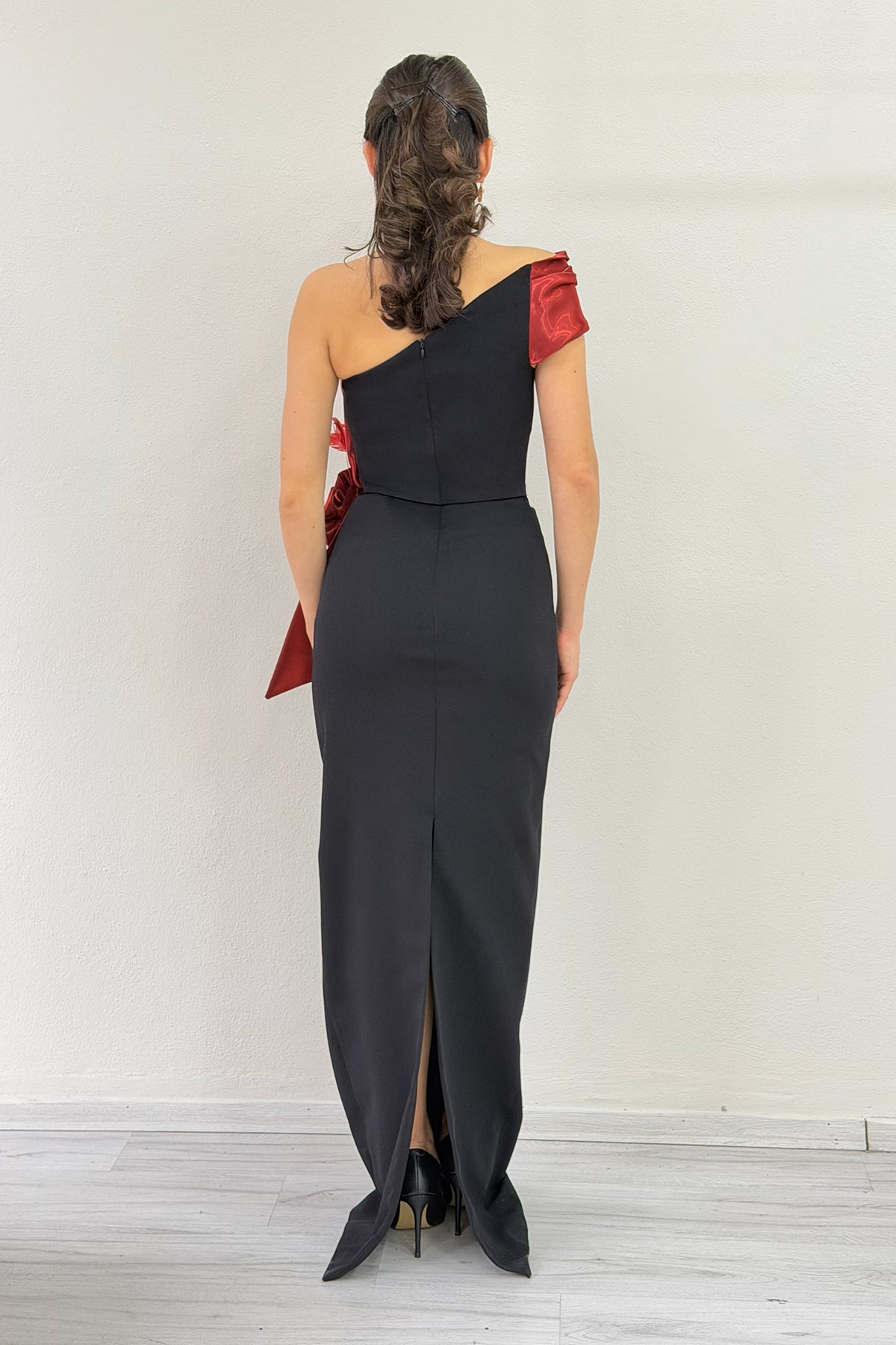Women's One-Shoulder Burgundy Striped Rose Detail Mermaid Evening Dress