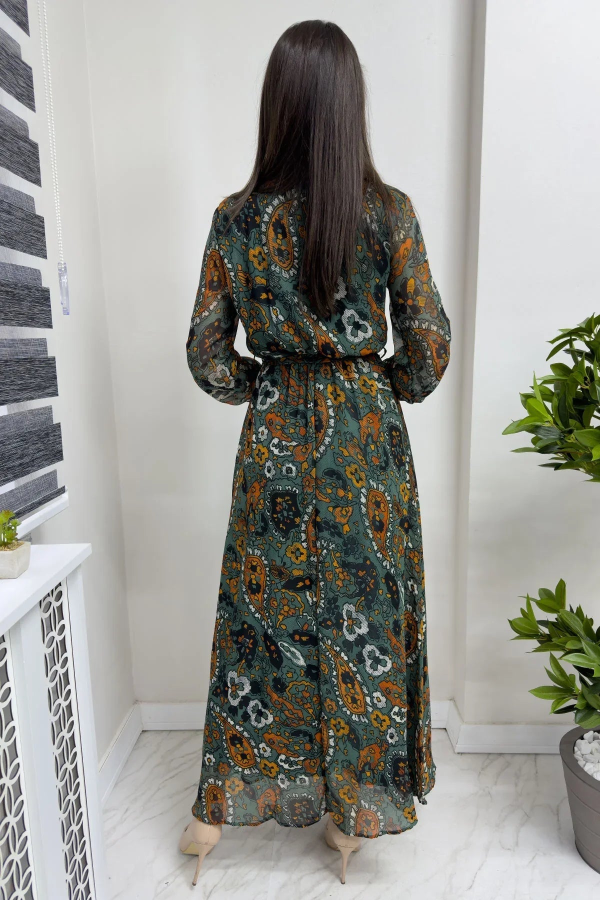 Women's Green Shawl Pattern Cross-Over Neck Chiffon Dress The Women's Green Shawl Pattern Cross-Over Neck Chiffon Dress features an elegant shawl pattern with a modern and stylish design. Carrying the energy of vibrant green, this dress offers graceful movement with every step thanks to the fluid structure of the chiffon fabric. The crossover neck detail offers a feminine décolletage, emphasising your elegance and providing a perfect fit for the body. Colour and Fabric Green Colour: A natural and fresh colour, green offers a vibrant and energetic look. As a shade that reflects elegance and grace, it attracts attention in any setting. Shawl Pattern: Shawl patterns add a chic and sophisticated air to the dress, creating a modern touch. Chiffon Fabric: Thanks to its fluid and lightweight structure, it gives the dress an elegant movement and offers comfortable wear. Design Details Crossover Neckline: Creates an elegant look by offering a stylish and feminine neckline. The crossover neckline detail adds a sophisticated touch to the dress. Shawl Pattern: Shawl patterns added to a green background give the dress an aesthetic look. Body-Hugging Cut: The dress fits the body elegantly, creating a stylish silhouette. Flowing Fabric: The flowing structure of the chiffon fabric provides an elegant flow with every movement. Fabric and Comfort Chiffon fabric provides all-day comfort with its lightness and fluidity. The shawl pattern adds a modern touch to the dress while enhancing its elegance and sophistication. Thanks to its fluid structure, the dress adapts to the body and offers a comfortable feel. Areas of Use Special Occasions and Evening Dinners: You can achieve an elegant style by pairing them with chic jewellery and high heels. Cocktails and Social Events: Enhance your elegance with minimal jewellery to create a sophisticated look. Everyday Outfits: Complete your look comfortably with comfortable shoes. Summer Events: Lightweight chiffon fabric offers an ideal option for comfortable wear during the summer months. Benefits The vibrant and elegant appearance of the green colour reflects your style in any setting. The crossover neckline offers a chic and feminine décolletage. The flowing chiffon fabric combines comfort and elegance. The dress's figure-hugging cut creates a chic silhouette. This elegant design stands out in searches for green shawl-patterned chiffon dresses, crossover neckline chiffon dresses, or shawl-patterned chiffon dresses. Visit The ZKS now and complete your style with this chic design! ✨👗