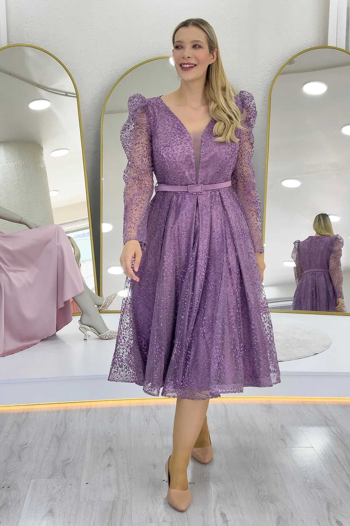 Das lilafarbene Glitzer-Abendkleid mit Glockenrock und Gürtel ist ein besonderes Design, das Eleganz und modernen Chic vereint. Der aufwendig gearbeitete Glitzerstoff reflektiert das Licht aus jedem Winkel und sorgt so für einen umwerfenden Look. Der Glockenrock verleiht fließende Bewegungen und eine ausgewogene Silhouette für optimalen Tragekomfort. Der Gürtel betont die Taille elegant und zaubert eine feminine Silhouette. Dank ihres romantischen, zarten Fliedertons ist dieses Kleid die perfekte Wahl für alle, die bei besonderen Anlässen wie Hochzeiten, Verlobungen, Henna-Zeremonien, Abschlussfeiern und Partys im Mittelpunkt stehen möchten. Der leichte, fließende Schnitt sorgt für angenehmen Tragekomfort, auch über längere Zeit. Erhältlich in großen Größen für verschiedene Figurtypen, ist dieses Abendkleid ideal für Frauen, die Eleganz und Komfort gleichermaßen suchen. In Kombination mit hohen Absätzen und schlichten Accessoires entsteht ein eleganter Look; ergänzt durch auffälligen Schmuck ermöglicht er einen gewagten Stil.