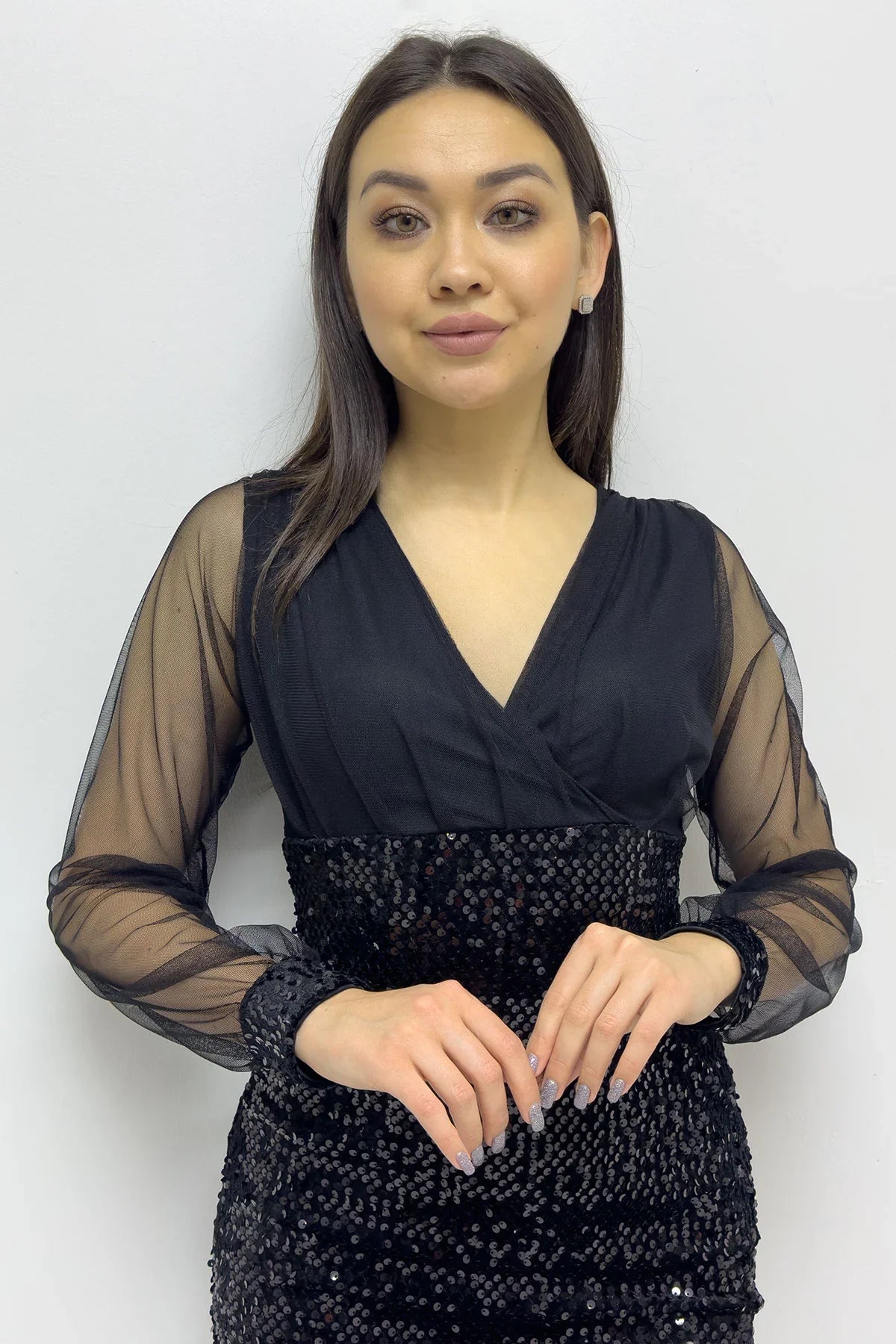 Black Cross-Over Neckline Sequined Short Evening Dress With its elegance and sophistication, the Black Cross-Over Neckline Sequined Short Evening Dress is a stunning design that will add sparkle to every moment, from evening parties to special events. It combines the nobility of black with the sparkle of sequins and the elegance of a cross-over neckline to achieve a sophisticated look. Its mini length highlights your graceful legs, while the sequins make you sparkle with every move. This dress allows you to showcase your style throughout the evening with a modern and chic look. Colour and Fabric Black Colour: A symbol of elegance and sophistication, black makes a striking statement in any setting. Sequin Fabric: Sparkling sequin details add a touch of glamour to the dress, creating a dazzling effect throughout the evening. Flexible Structure: The body-hugging, flexible fabric allows for comfortable movement. Design Details Crossover Neckline: Enhances your elegance by offering a sophisticated and refined décolletage. Sequin Details: Adds sparkle and glamour to the dress, ensuring you shine throughout the evening. Mini Length: Highlights your elegant legs and offers freedom of movement. Body-Hugging Cut: The dress's cut fits the body perfectly, emphasising your elegance and feminine curves. Fabric and Comfort The soft texture of sequined fabric ensures comfort during prolonged wear. Its flexible structure adapts to the body, offering both comfort and elegance. Its sparkling details will draw attention to you throughout the evening. Uses: Special Occasions and Evening Events: Achieve a perfect look with elegant high heels and minimal accessories. Cocktails and Dinner Parties: Create a sparkling style with sequined details and elegant jewellery. Weddings and Engagement Parties: The right choice for an elegant look. Parties: A design that reflects your style and allows you to dance comfortably in lively environments. Benefits The elegant look of black enhances your style in any setting. The crossover neckline design adds a sophisticated touch with its feminine décolletage. The sequins create a sparkling look that draws attention to you all night long. The mini length design creates a modern look by showing off your elegant legs. This eye-catching design stands out in searches for black mini evening dresses, sequined dresses or chic cross-neck dresses. Visit The ZKS now and complete your style with this sparkling design! ✨👗