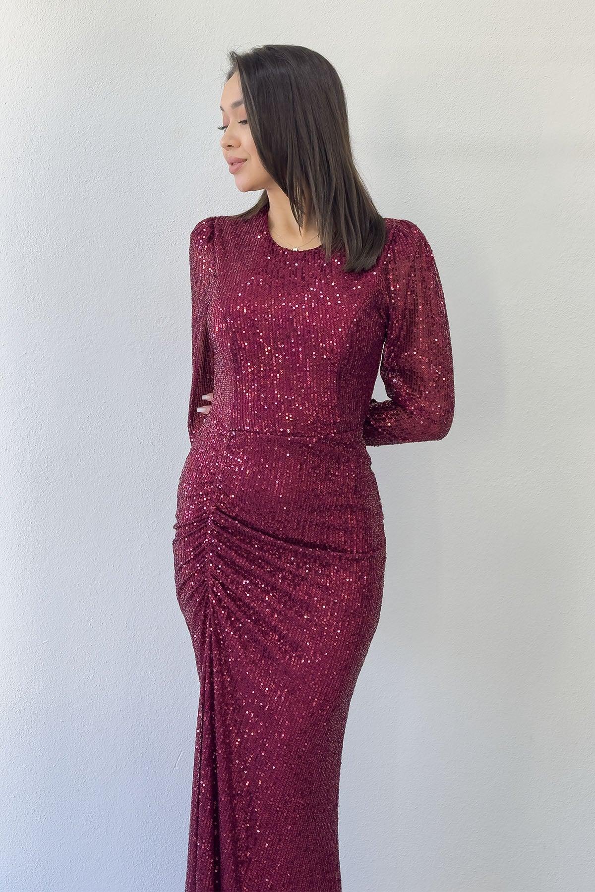 Burgundy Long Sleeve Bicycle Neck Sequined Beaded Draped Evening Dress The Burgundy Long Sleeve Bicycle Neck Sequined Beaded Draped Evening Dress, where eye-catching elegance and refined details come together, is designed to make you shine on your special days. Crafted from sparkling sequin fabric from top to bottom, it draws the night lights to you, while its draped form hugs the body to create an elegant silhouette. The bicycle neckline detail offers a simple and elegant look, while the long sleeves create a modern and sophisticated appearance. The noble tones of burgundy help you project a powerful and refined style at engagements, weddings, and special celebrations. This slitless model offers freedom of movement thanks to its elegant design; when paired with high heels, minimalist earrings and a chic clutch bag, it creates the perfect outfit for an evening event. Available in plus sizes, this evening dress flatters every woman's figure and will become an essential piece in your wardrobe. 📌 Key Features: Colour: Burgundy Fabric: Sequins Collar: Boat neck Sleeves: Long sleeves Fit: Drapey, body-hugging Occasions: Engagement, wedding, party, graduation, special evenings Size Range: Standard and plus sizes available