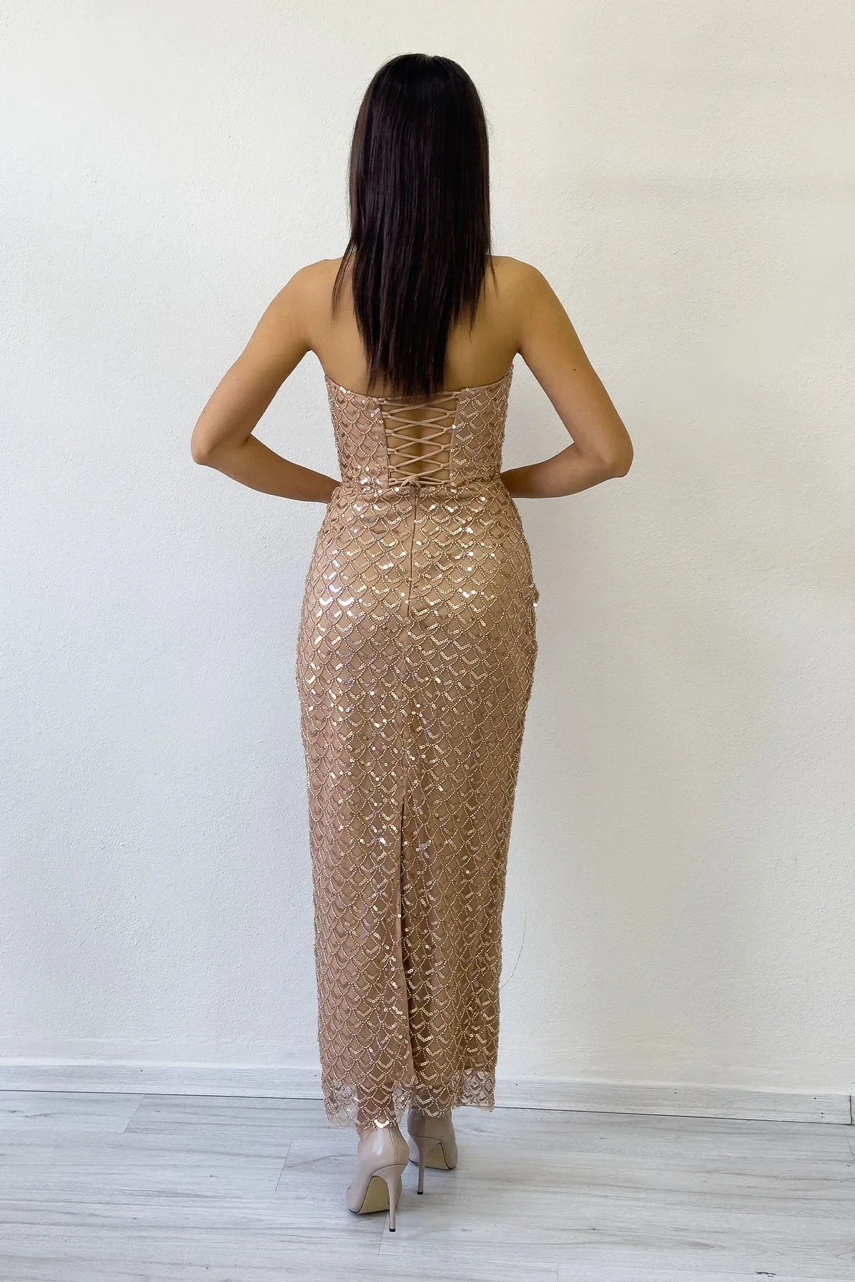 Gold Strapless Midi Length Sequin Evening Dress