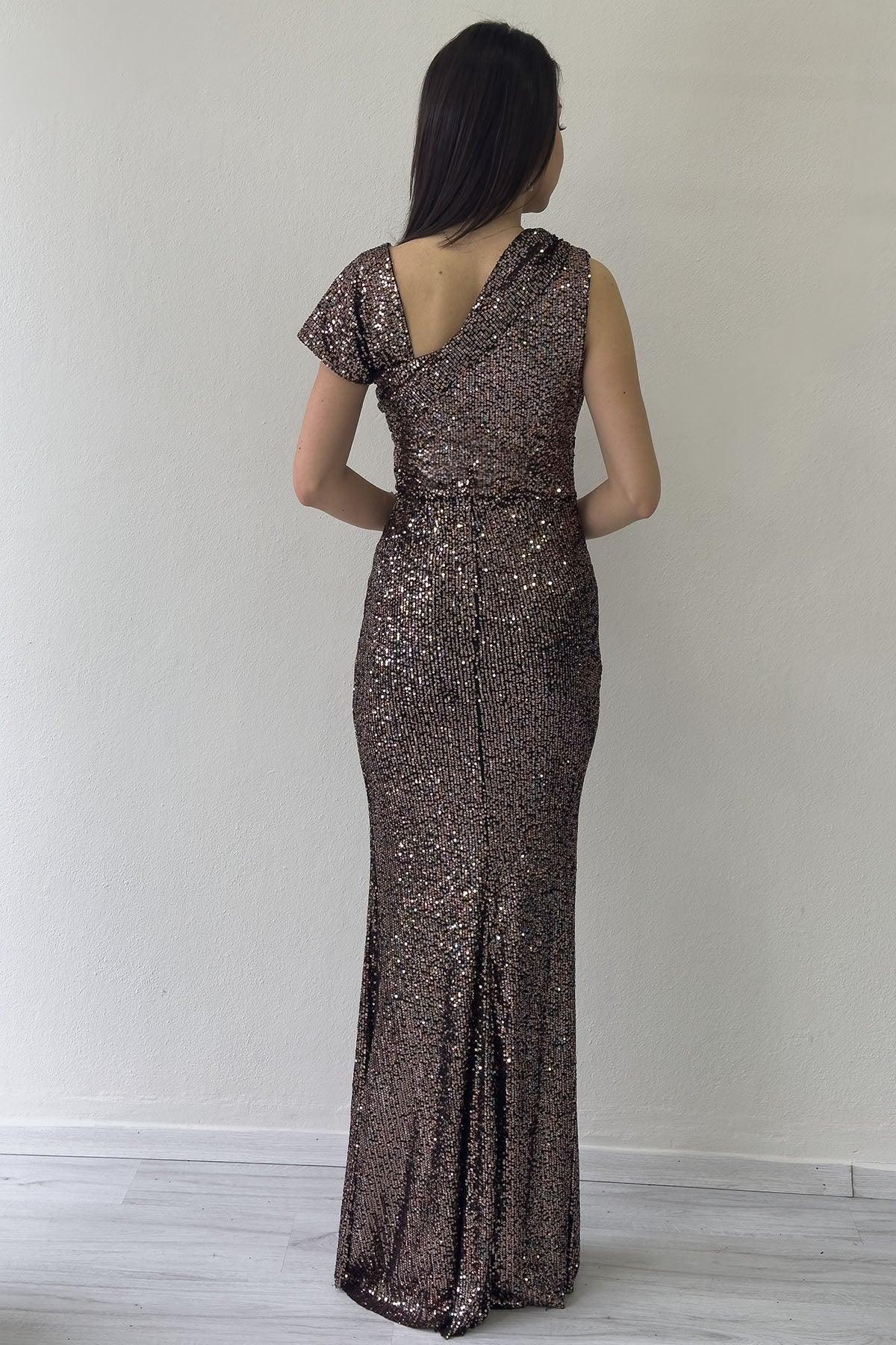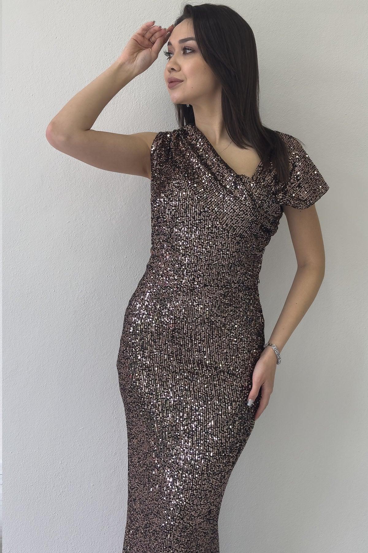 The Women's Mink Asymmetric Collar Sequined Plus Size Fishtail Evening Dress, which combines sparkle with elegance, is designed to make you feel special from head to toe on special occasions. The noble tone of mink dazzles with its skin-flattering hue, while the sequin details sparkle with the light to create a sophisticated look. The asymmetrical neckline accentuates the shoulders, taking elegance to the next level. The body-hugging fishtail silhouette has been reinterpreted specifically for plus sizes, offering both comfort and aesthetics. Features such as a high slit or train detail allow you to make a bold entrance at evening events. This dress makes you the epitome of elegance and confidence at all special occasions such as weddings, engagements, graduation balls, and cocktail parties. Fabric: Stretch-lined sequin fabric Colour: Mink (shimmering) Neckline: Asymmetrical shoulder cut-out Cut: Body-hugging fishtail silhouette Details: Fully sequined, lined interior Size: Plus size compatible (XS – 5XL) Occasion: Wedding, graduation, gala, special events Body Type Suitability: Ideal for hourglass, pear, and inverted triangle shapes Care: Hand wash inside out or dry clean recommended