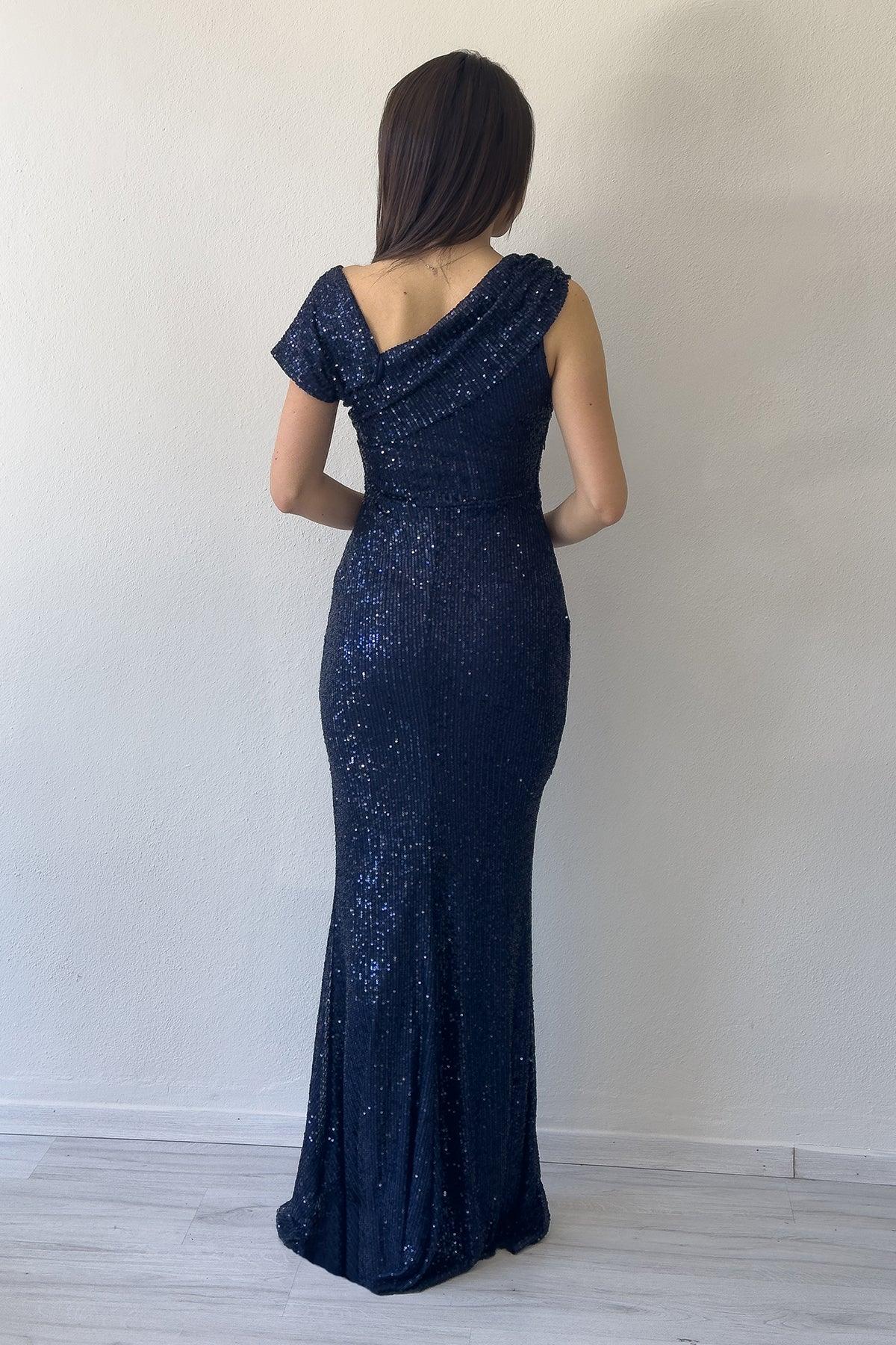 Navy Blue Sequined Fishtail Maxi Evening Dress
