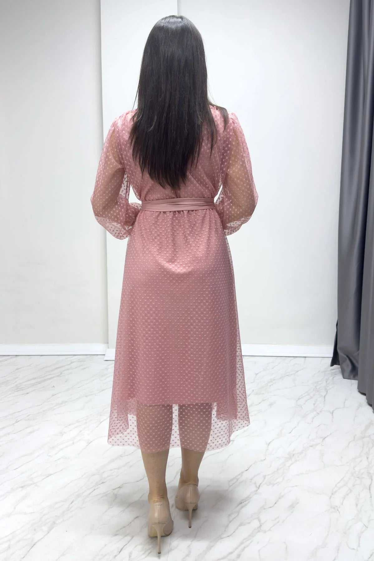 Pink Polka Dot Belted V-Neck Flared Dress Designed in a vibrant pink colour with a charming polka dot pattern, the Pink Polka Dot Belted V-Neck Flared Dress adds an energetic and elegant touch to your style. The V-neck design and flared cut offer both a feminine look and freedom of movement, while the belt detail elegantly accentuates your waist. It is an ideal choice for both everyday wear and special occasions. Colour and Fabric Pink Colour: A cheerful and energetic tone provides an eye-catching look. Polka Dot Pattern: Adds movement with a fun and dynamic detail. Flowing Fabric: Offers comfortable wear with its light and comfortable texture. Design Details V-Neck Cut: Highlights the neckline with an elegant décolletage. Belt Detail: Emphasises the waistline, creating a feminine look. Flared Cut: Creates a flowing and elegant silhouette. Midi Length: A length suitable for both everyday wear and special occasions. Fabric and Comfort Its lightweight texture ensures comfortable wear. Its fluid structure offers freedom of movement, creating a stylish look. Its breathable fabric makes it ideal even on hot days. Wear Opportunities Everyday Outfits: Achieve a simple and stylish look with sandals and a crossbody bag. Special Occasions: Pair with high heels and elegant accessories for an impressive style. Office Chic: Achieve a professional look with a classic blazer and simple jewellery. Photo Shoots: Capture unforgettable moments with the energy of pink and the liveliness of the polka dot pattern. Benefits The pink tone offers an eye-catching and energetic look. The polka dot pattern adds a fun and dynamic feel. The belt detail and flared cut provide a feminine look and comfort. Its versatile design makes it suitable for both everyday wear and special occasions. This chic and fun dress stands out in searches for pink polka dot dresses, flared cut everyday dresses, or feminine chic dresses. Visit The ZKS now and add energy to your style with this elegant design! 💕✨👗