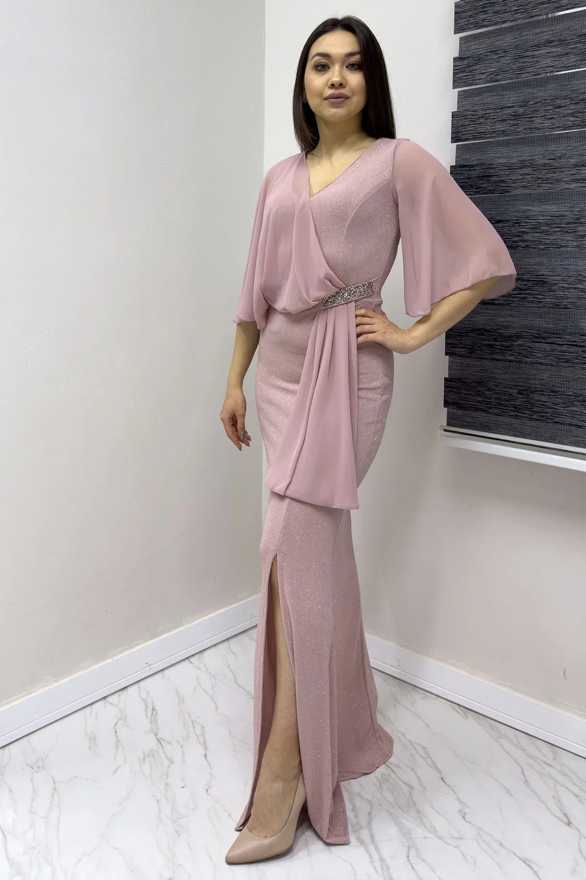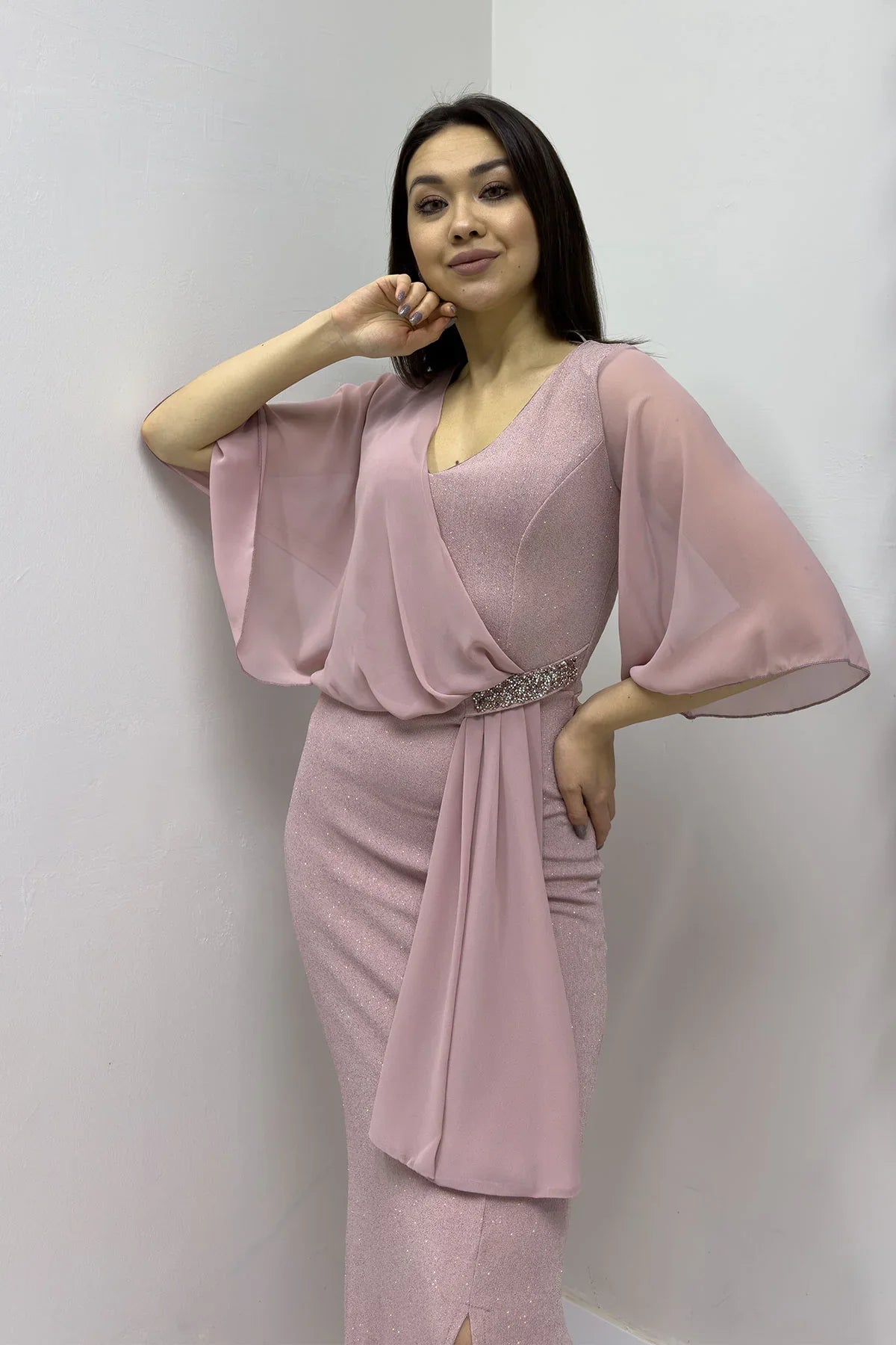 Powder Pink Glitter Maxi Evening Dress