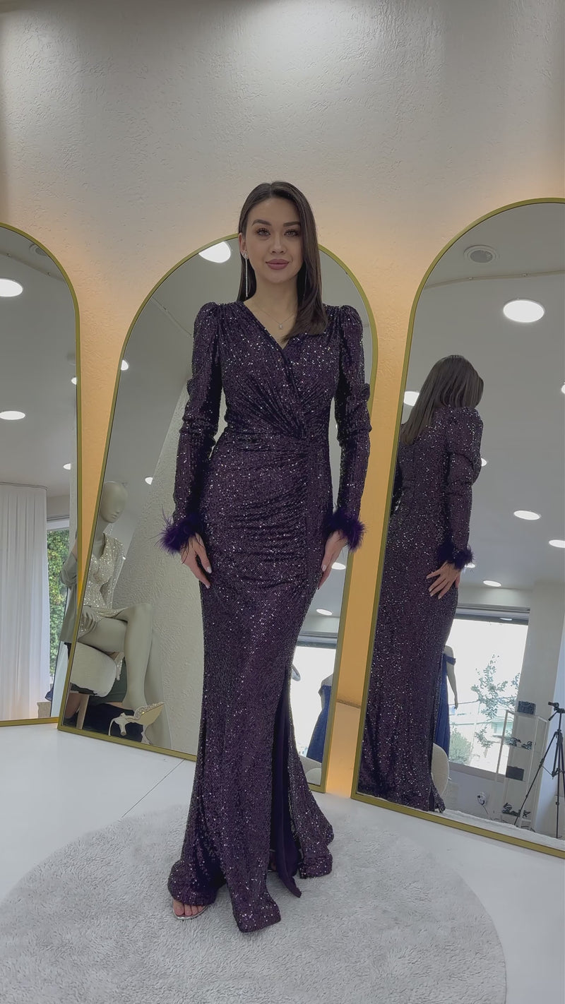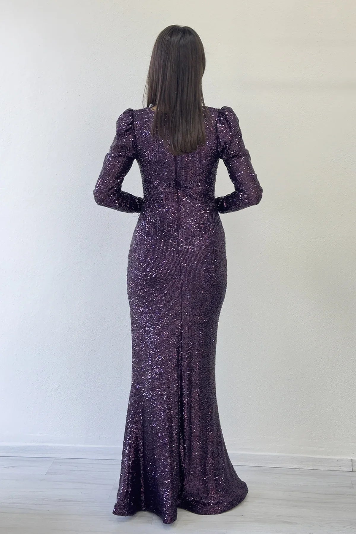 Combining sparkle and elegance, this burgundy cross-neckline fishtail evening gown with sequin details and a slit is set to be a favourite among women who want to stand out at special events. The modern fishtail silhouette gracefully hugs the body, accentuating feminine curves, while the sparkling sequin fabric makes every step magical. The crossover neckline detail at the bust adds a sophisticated touch to the elegance, while the off-the-shoulder embellishments lend the dress a striking movement. The fishtail design, which gracefully accentuates the hip and leg line, meets a deep slit, boosting your confidence and adding fluid elegance to your walk. One of the season's most eye-catching colours, plum, with its regal tone, allows you to make a powerful style statement at evening events, engagements, weddings and gala nights. When paired with high heels and minimal jewellery, the dress's sparkle comes to the fore; when complemented with bold accessories, you can achieve the most striking look of the night. This dress offers comfortable wear with its high-quality lining and relaxed fit. Available in sizes ranging from XS to XL and featuring elegant details, it is a special piece that every woman should have in her wardrobe.