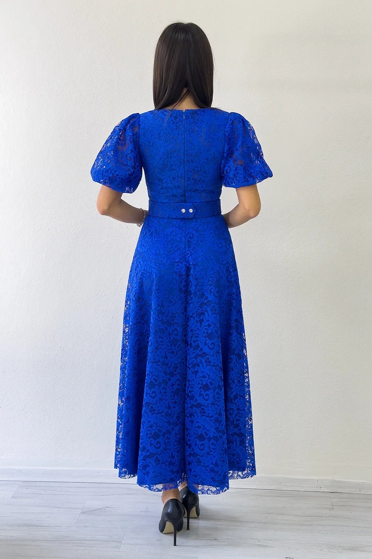 Saxe Blue Lace Midi Length Flared Evening Dress
