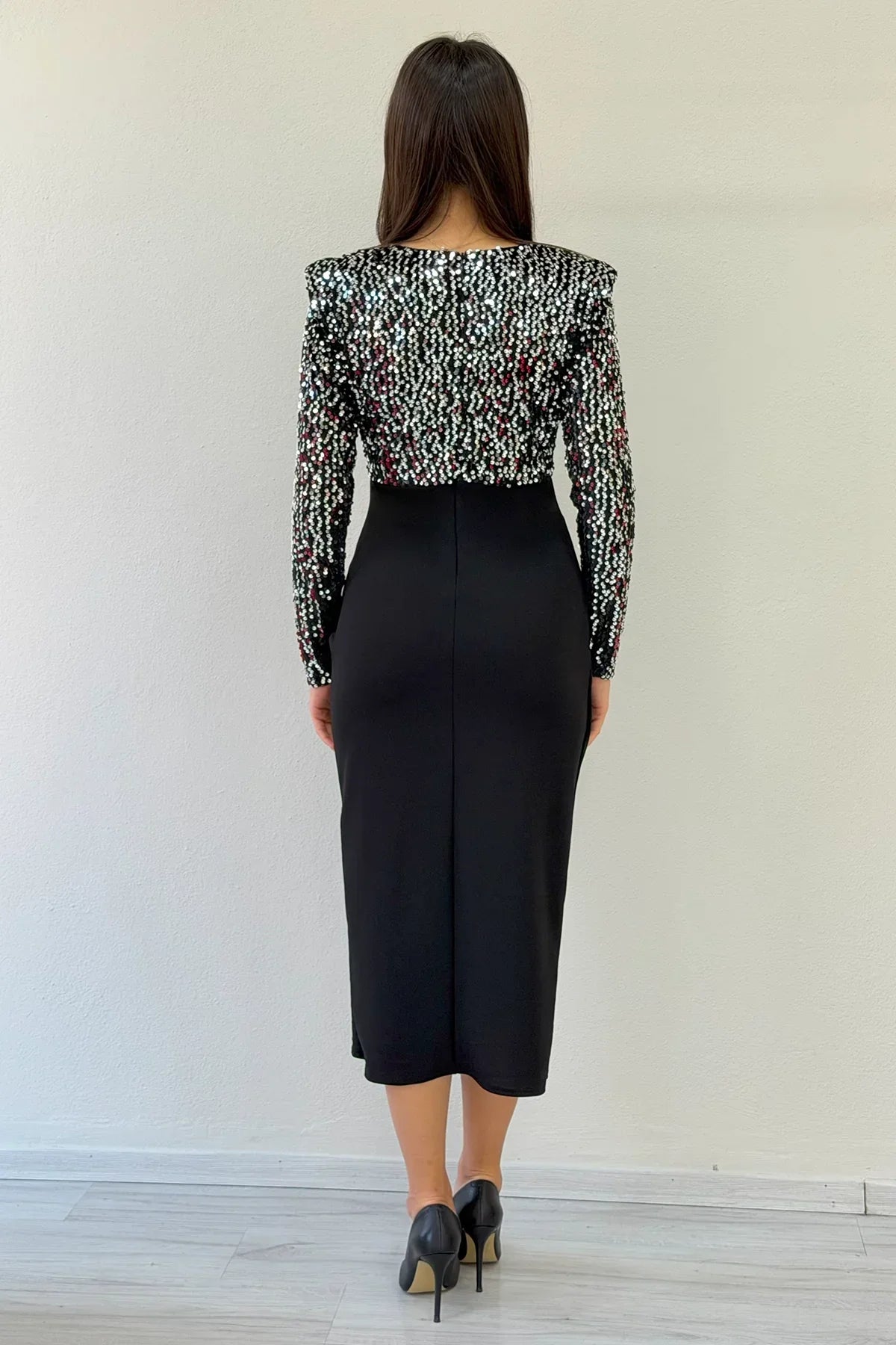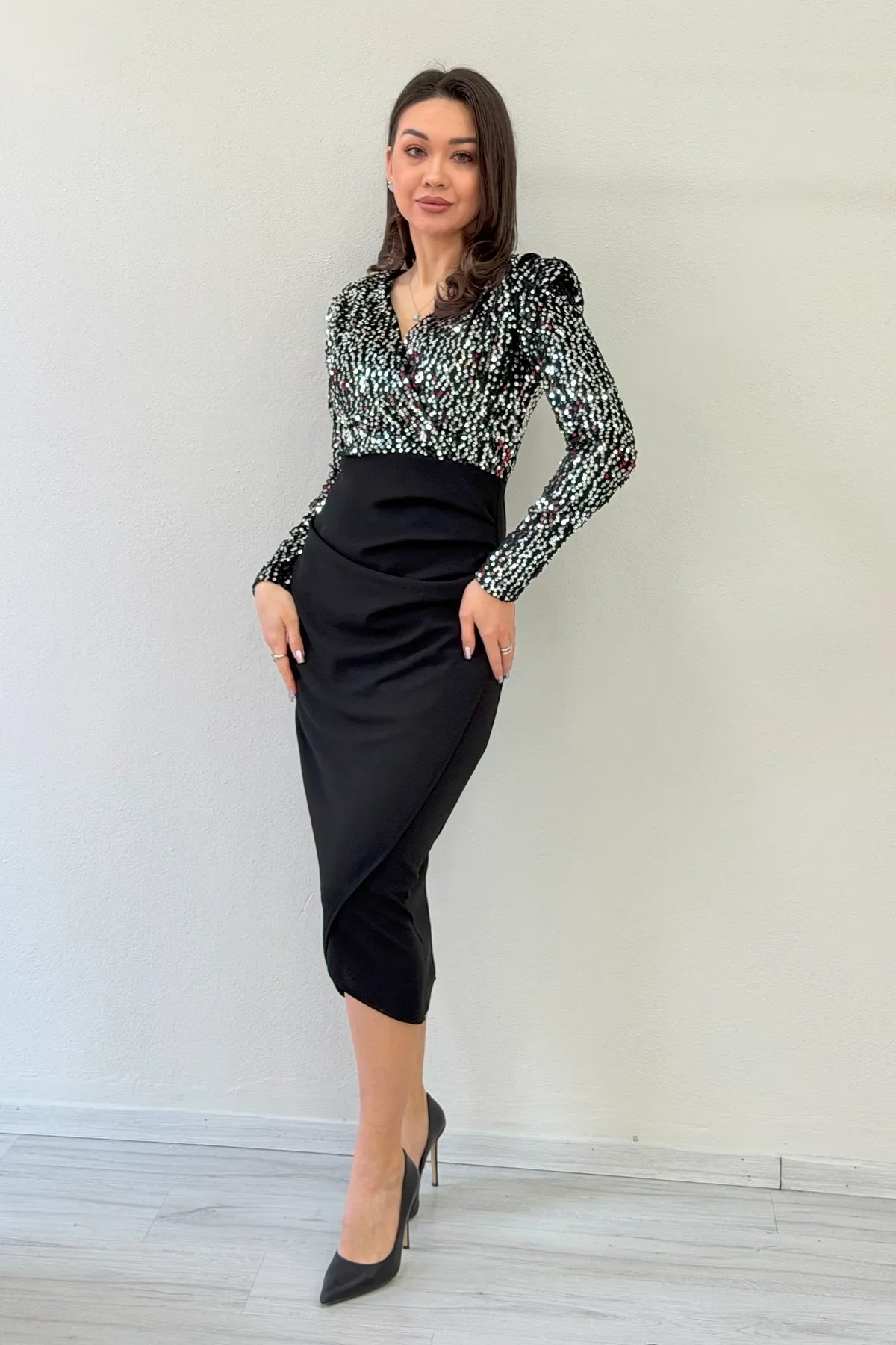 Silver Sequined Cross-Over Neckline Drape Midi Evening Dress, the perfect choice for those seeking a chic evening gown that combines modern elegance with light. The structure of the shiny silver sequins, which amplify the sparkle with every step, combines with the feminine touch of the crossover neckline and the draped details at the waist, which naturally flatter the figure and accentuate the silhouette. Both the regal look of the midi length and the powerful silhouette created by the shiny fabric in the evening lights make this the perfect signature piece for those who want to stand out at special events. The sequin fabric of the dress offers slight elasticity, ensuring freedom of movement without compromising on elegance. Its lined inner structure does not irritate the skin, providing comfort, especially during long events. The crossover neckline area makes the bust line appear more balanced and stylish, creating an extremely elegant look both in photographs and in real life. The draping at the waist camouflages the tummy area, creating a more fitted silhouette. The midi length is both chic and modern—perfectly complemented by high heels. Where to Wear It? This dress can be a favourite for many special occasions such as engagements, weddings, galas, cocktail parties, dinners, and New Year's Eve events. The light-catching effect of the silver colour complements every skin tone and pairs effortlessly with both simple and bold accessories. Paired with stiletto heels, a minimalist handbag, and cool makeup, it transforms into the perfect evening ensemble. Who is it suitable for? It is an excellent choice for anyone who wants to appear slimmer, loves styles that accentuate the waistline, and prefers designs that are sparkling yet elegant. The cross-neckline fits most body types well, whether you have broad shoulders, narrow shoulders, or a smaller or larger bust area. Key Features Silver sequin glitter fabric Feminine form with a crossover neckline Drape gathering effect at the waist Lined construction for comfortable wear Midi length for modern elegance Premium look suitable for special occasions and evenings